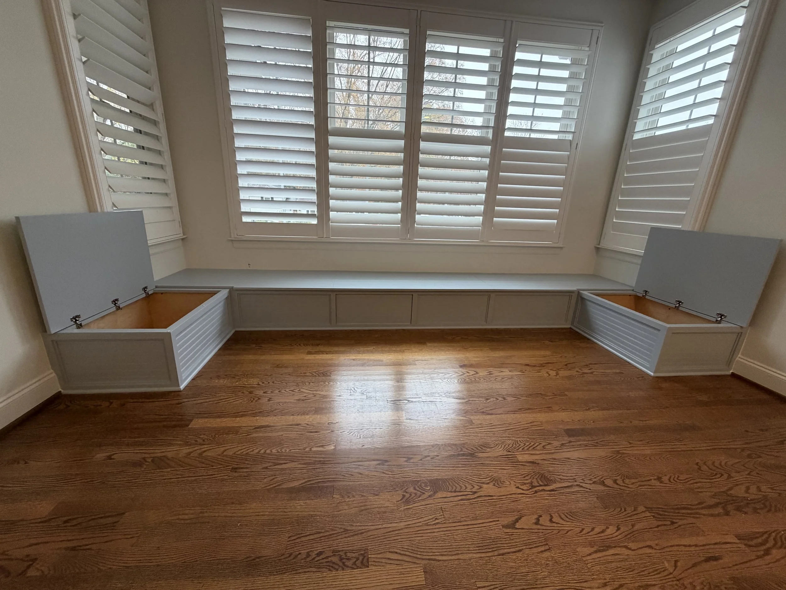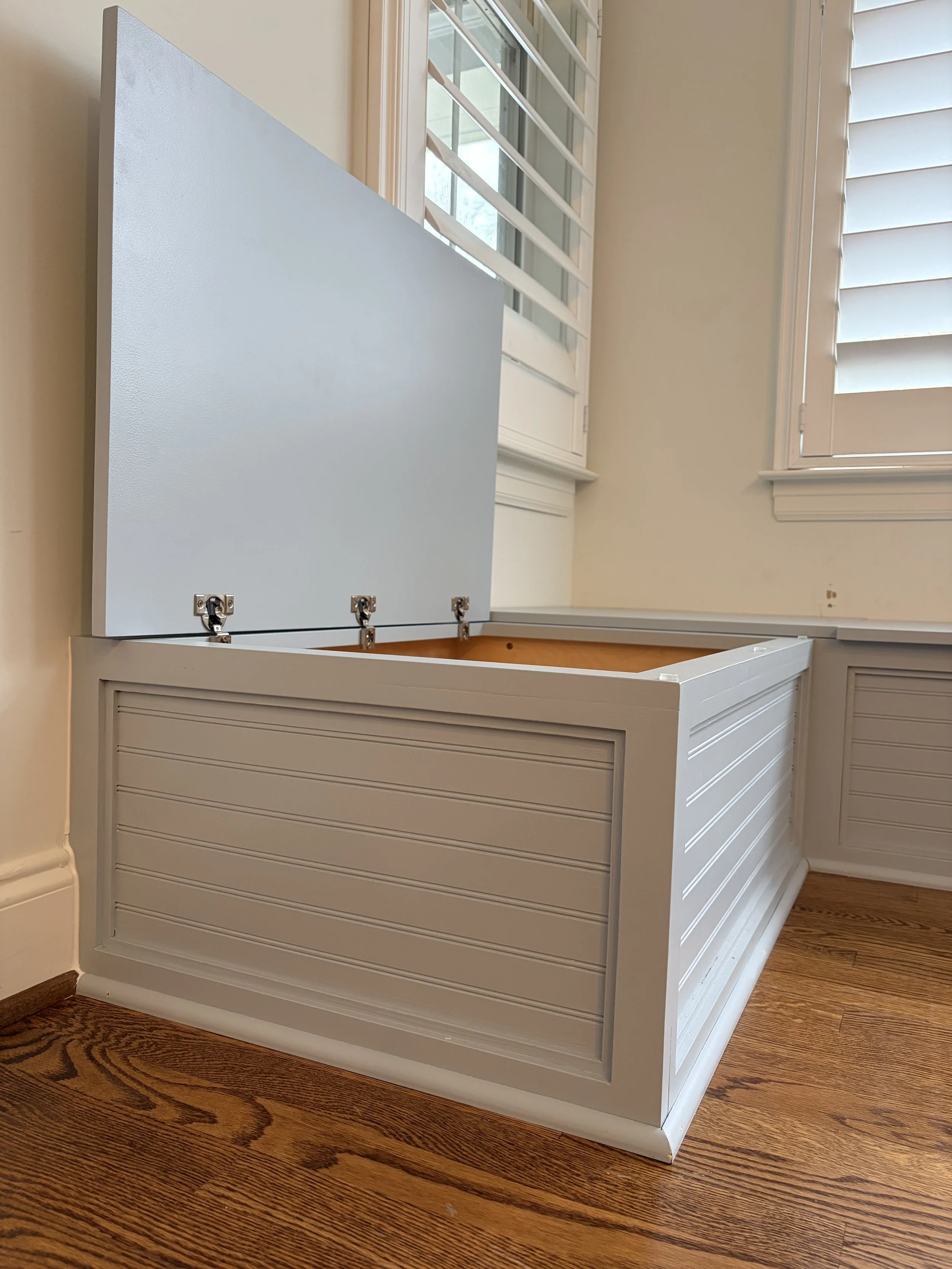 Custom designed to fit a dining space, with ends that open up for storage and a unique bead board design element